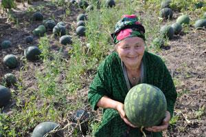 На снимке: Н.Г. Красюк рада хорошему урожаю арбузов.