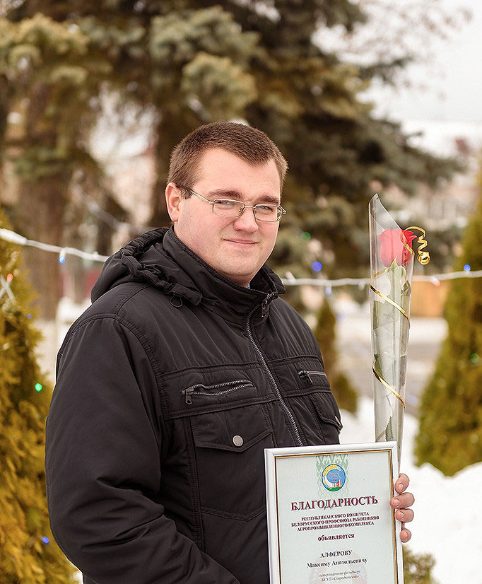 Максим Алферов, ветеринарный фельдшер КСУП «Скороднянский», получил Благодарность Министерства сельского хозяйства и продовольствия за добросовестный труд, достижение высоких производственных показателей лично из рук министра сельского хозяйства Анатолия Хотько.