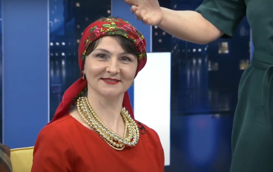 Ирина Хотько демонстрирует разные способы повязывания платков (скриншот из видео)
