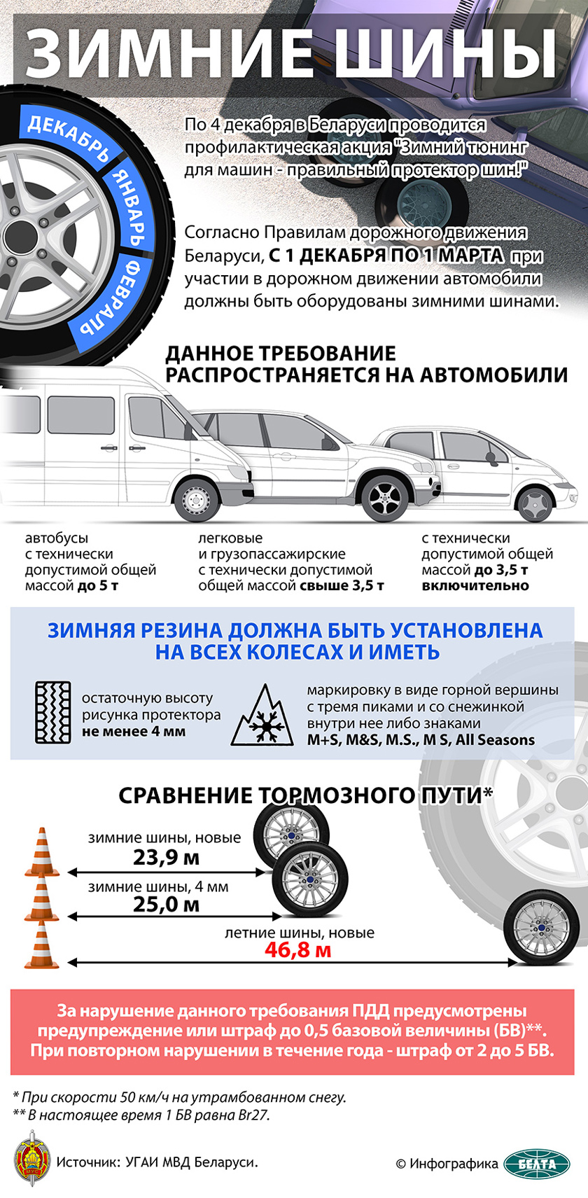 ГАИ напоминает: с 1 декабря по 1 марта автомобили должны быть оборудованы зимними шинами