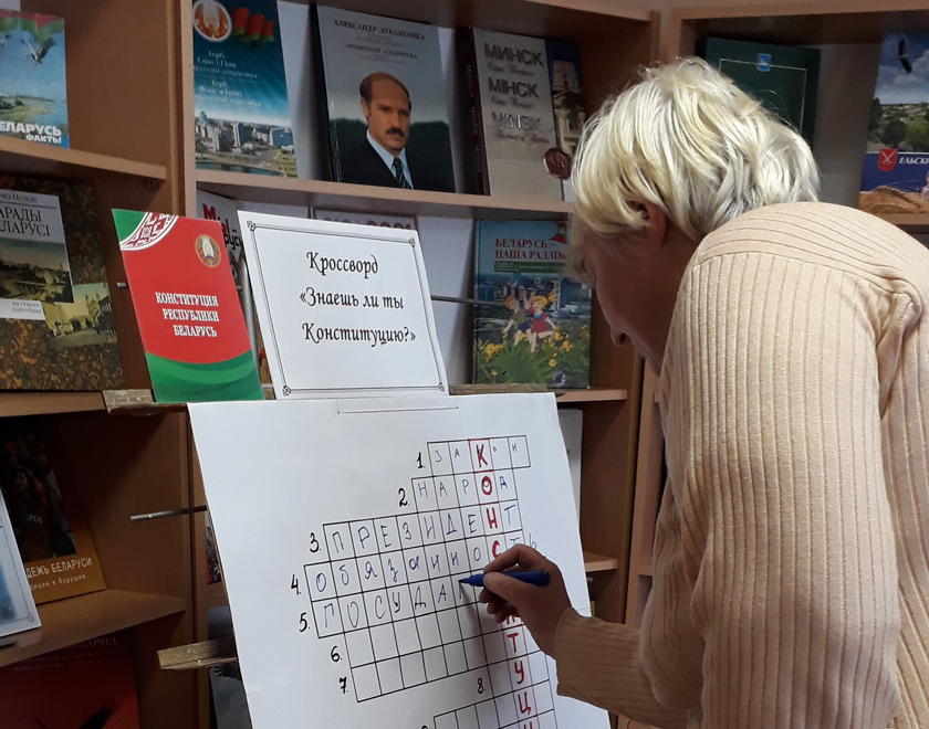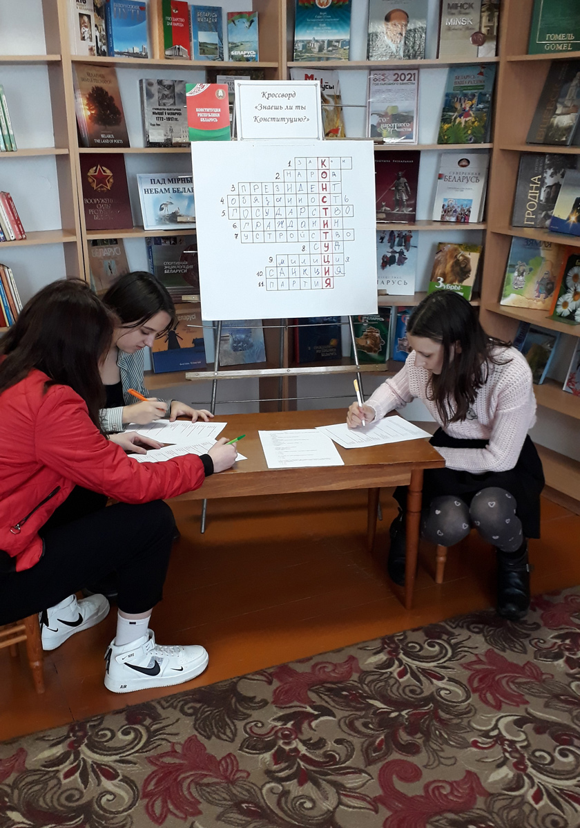 Учащиеся старших классов, а также и другие посетители разгадывали кроссворд «Знаешь ли ты Конституцию?» и проверяли свои знания, отвечая на вопросы теста «Конституция Республики Беларусь».