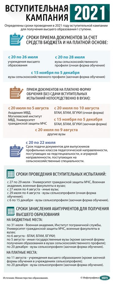 9 августа закончится прием документов абитуриентов, поступающих на платной основе, а для абитуриентов, которые выбирают для себя сельское хозяйство — 10 августа», — добавила она. Зачисление на бюджет планируется провести до 5 августа, а закончить вступительную кампанию в вузы — 11 августа зачислением на платную форму.