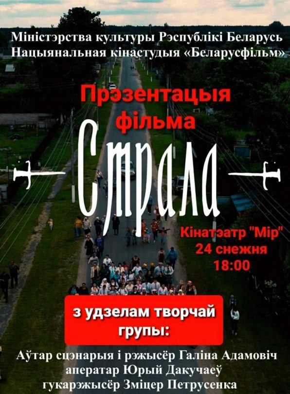 24 декабря 2021 года в гомельском кинотеатре «Мир» (ул. Ильича, 51Б) состоится презентация нового документального фильма Национальной киностудии «Беларусьфильм» «Стрела». Планируется, что гомельским зрителям картину представит творческая группа в составе: режиссера и автора сценария картины Галины Адамович, оператора Юрия Докучаева и звукорежиссёра Дмитрия Петрусенко.