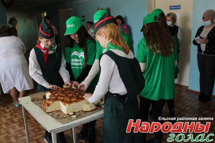А председатель Старовысоковского сельсовета Мария Алесич и идеолог КСУП «Совхоз «Коммунист» Татьяна Лось преподнесли огромный каравай – подарок от администрации и тружеников сельхозпредприятия и заширских кулинаров.