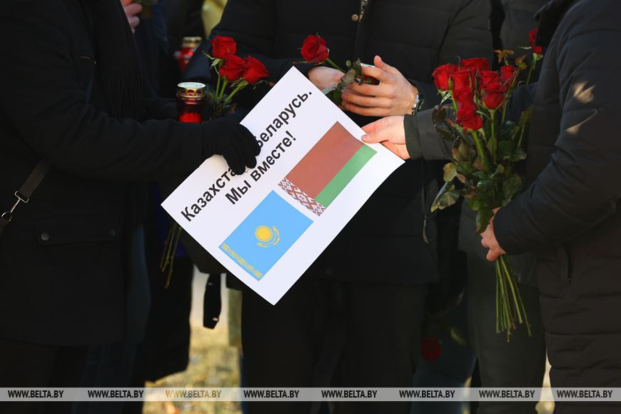 Белорусы тоже не остались в этот день в стороне. Они выражают свою поддержку народу Казахстана в этот непростой период и несут цветы к посольству Казахстана в Беларуси.