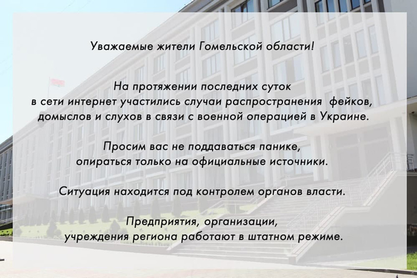 С таким обращением к жителям Гомельщины выступило руководство облисполкома в телеграмм-канале «Гомельщина официально».