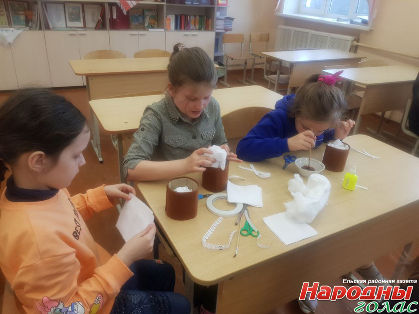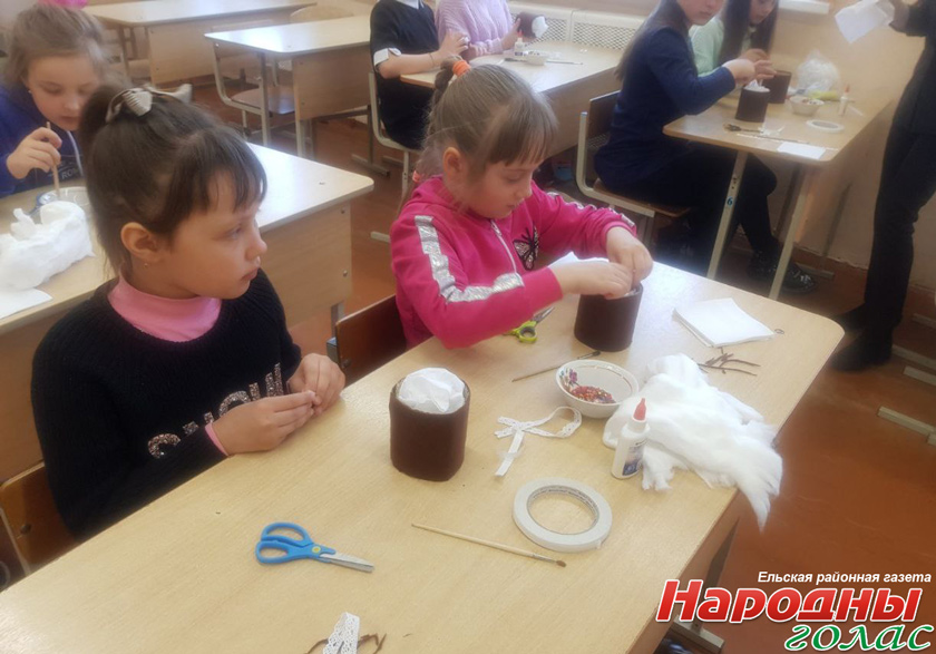 На весенних каникулах в Ельской районной гимназии уже начали подготовку к празднику Светлой Пасхи. Для ребят сегодня в учреждении образования проходят мастер-классы по изготовлению поделок своими руками: пасхальных куличей, крашеных яиц в стиле вытинанки и технике декупаж.