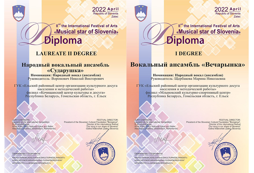 Вокальный ансамбль «Вечарынка» Млынокского культурно-спортивного центра и народный вокальный ансамбль «Сударушка» Кочищанского центра культуры и досуга стали победителями — обладателями дипломов I и II степени — во II Международном зарубежном фестивале искусств «Musical star of Slovenia -2022».