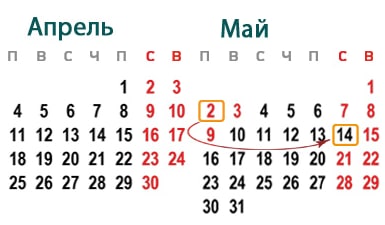Днями отдыха будут 30 апреля (суббота), 1 (воскресенье), 2 (понедельник) и 3 (вторник) мая — 4 дня. Отдыхать три дня подряд будут с 7 (суббота) по 9 (понедельник) мая.