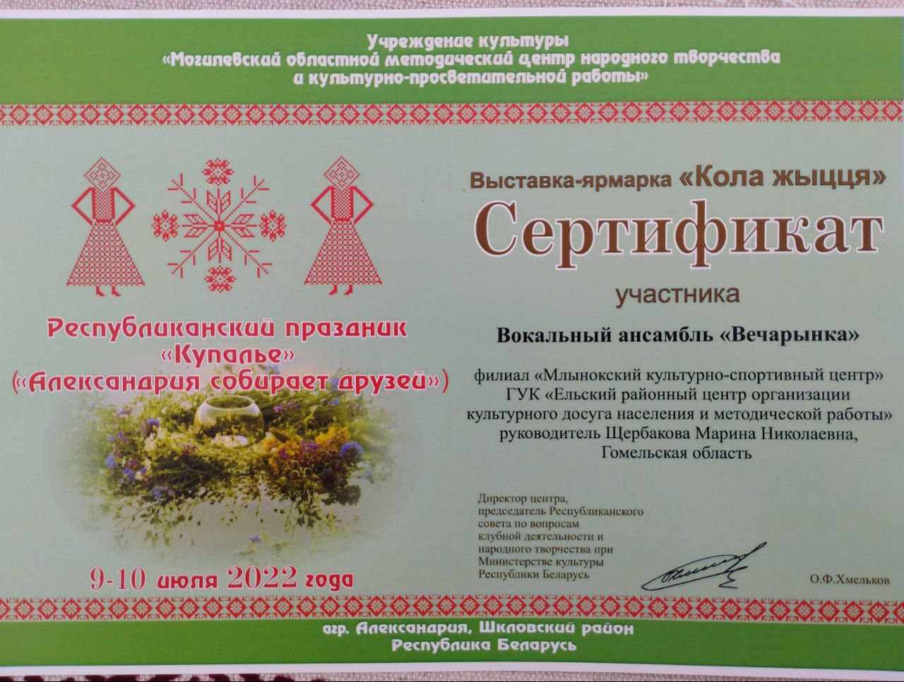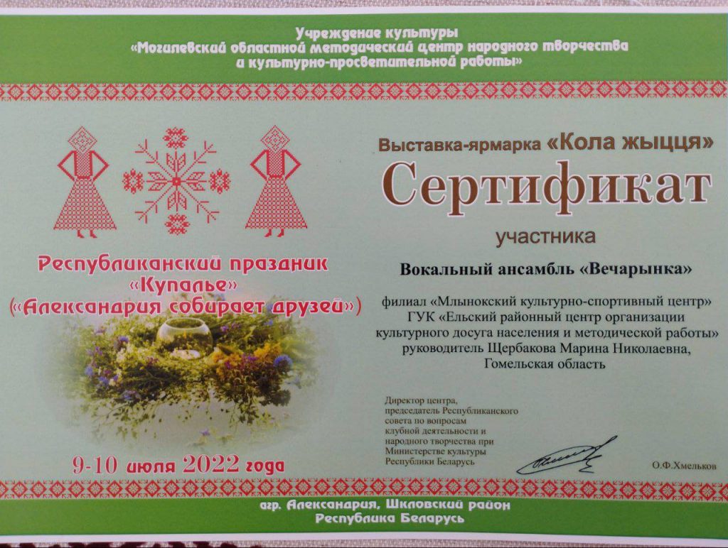 Ансамбль «Вечарынка» Млынокского КСЦ принял участие в республиканском празднике «Купалье» («Александрия собирает друзей»), который прошел 9-10 июля в агрогородке Александрия Шкловского района.