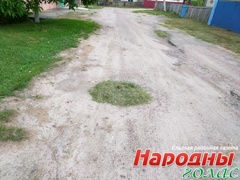 Свежескошенной травой жители ул. Рокоссовского в г. Ельске заделывают ямы в дороге, которая уже много лет не ремонтировалась.