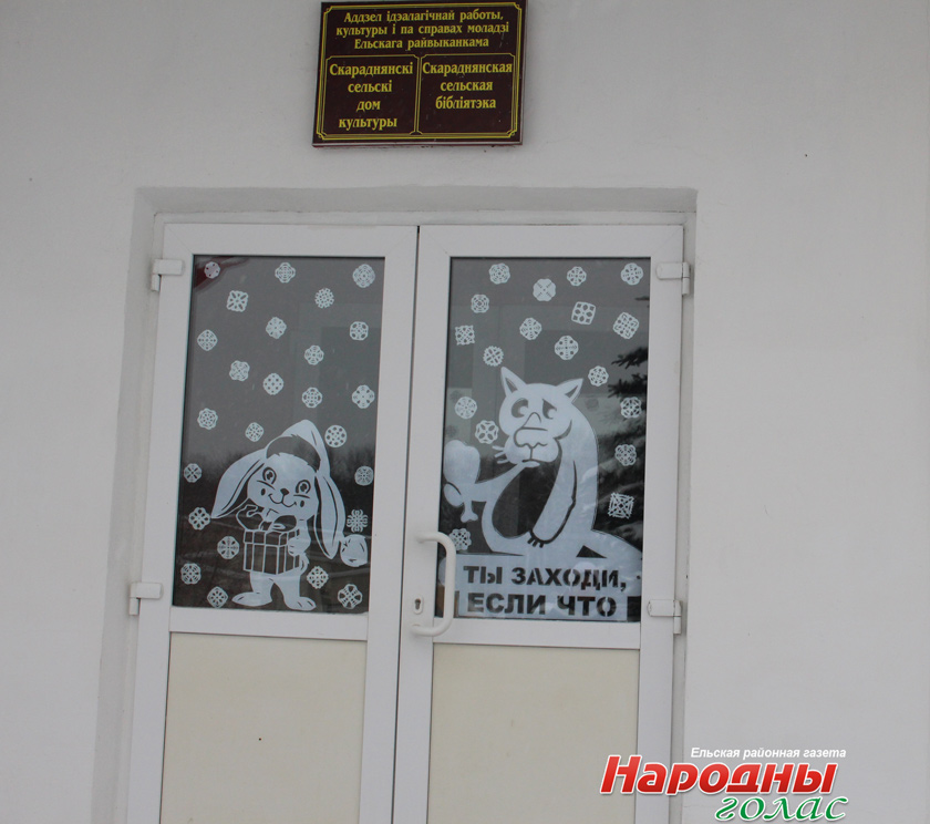 У Скараднянскім сельскім Доме культуры таксама ва ўсю моц рыхтуюцца да навагодніх праграм. Вокны ўстановы культуры ўжо стракацяць фігурамі галоўных сімвалаў года – ката і зайца. Іх выразаюць самі работнікі і наклейваюць на вокны. Культарганізатар СДК Юлія Шчыпіла па-дзялілася будучымі планамі: