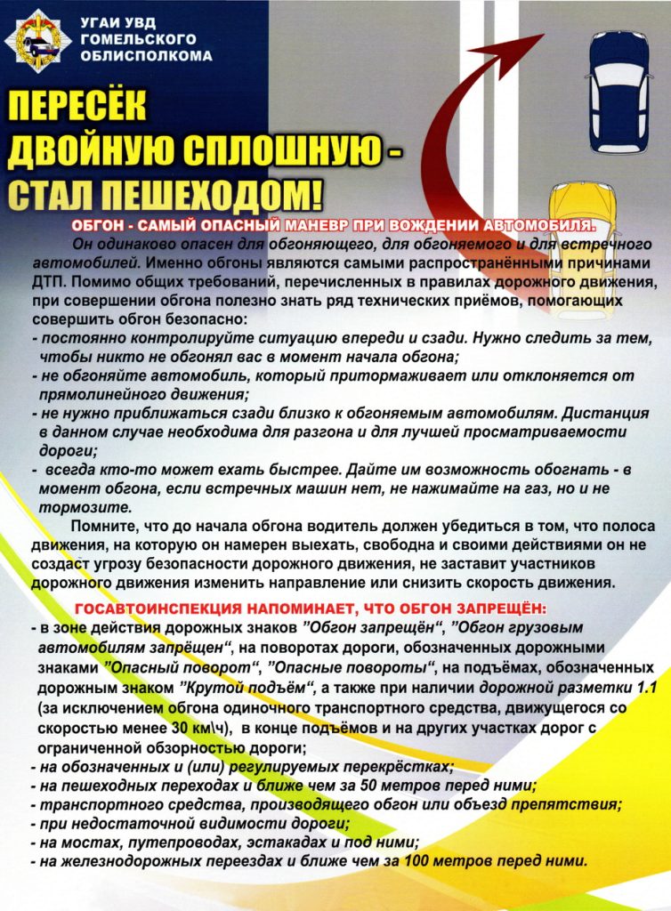 Согласно Кодексу Республики Беларусь об административных правонарушениях, водителю, нарушившему правила обгона либо выехавшему на полосу встречного движения, когда правилами дорожного движения это запрещено, предусмотрена ответственность в виде штрафа в размере от  2 до 10 базовых величин с лишением права управления транспортными средствами сроком до 1 года или без лишения.