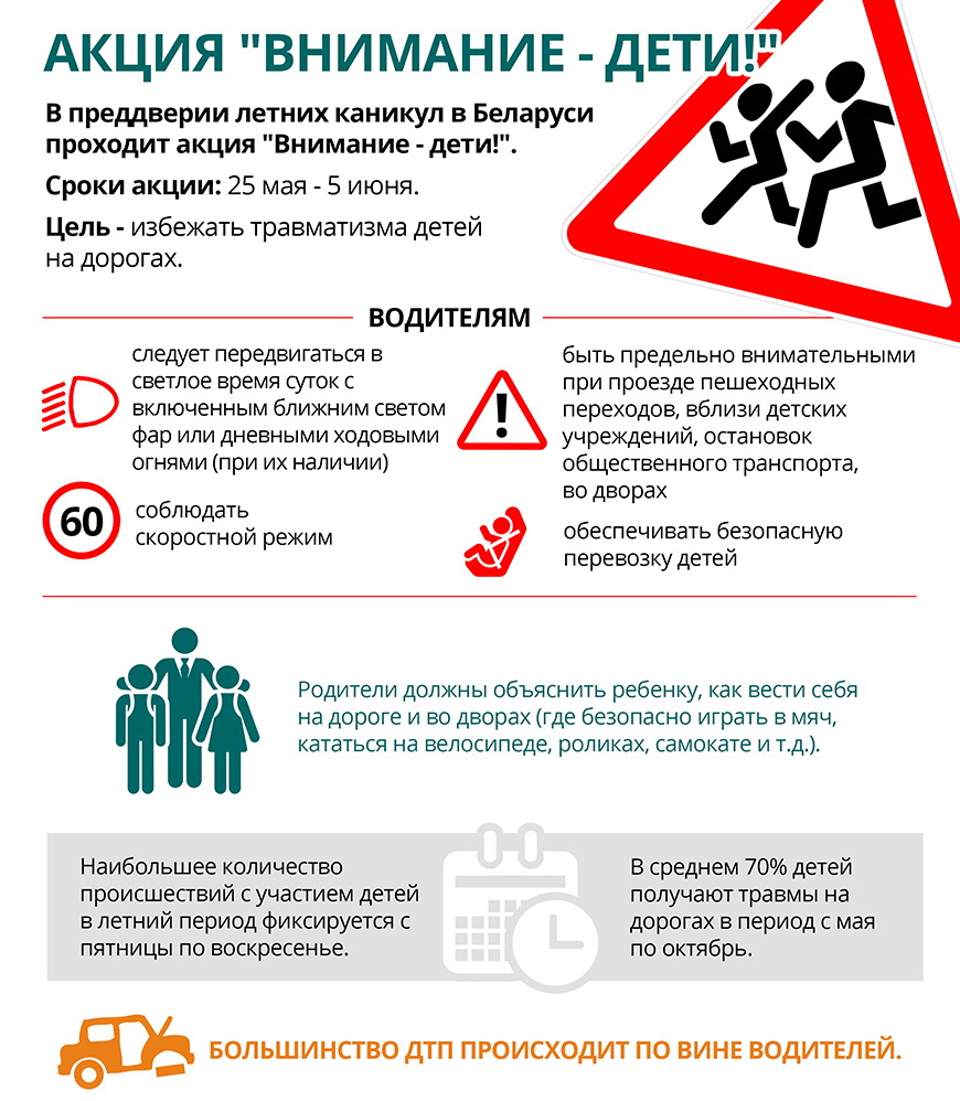 В связи с окончанием учебного года и началом летних каникул, в целях предупреждения дорожных происшествий с участием детей и подростков, с 25 мая по 5 июня в Республике Беларусь пройдет республиканское профилактическое специальное комплексное мероприятие «Внимание: дети!». В это время (в соответствии с требованием п.166.9 Правил дорожного движения) необходимо в обязательном порядке в светлое время суток включать ближний свет фар или дневные ходовые огни (при их наличии) на всех механических транспортных средствах.