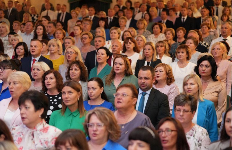 Форум посвящен началу учебного года и объединил представителей власти, руководителей отделов образования, спорта и туризма исполкомов, председателей районных профсоюзных комитетов, представителей педагогических коллективов учреждений образования — всего более 540 человек.