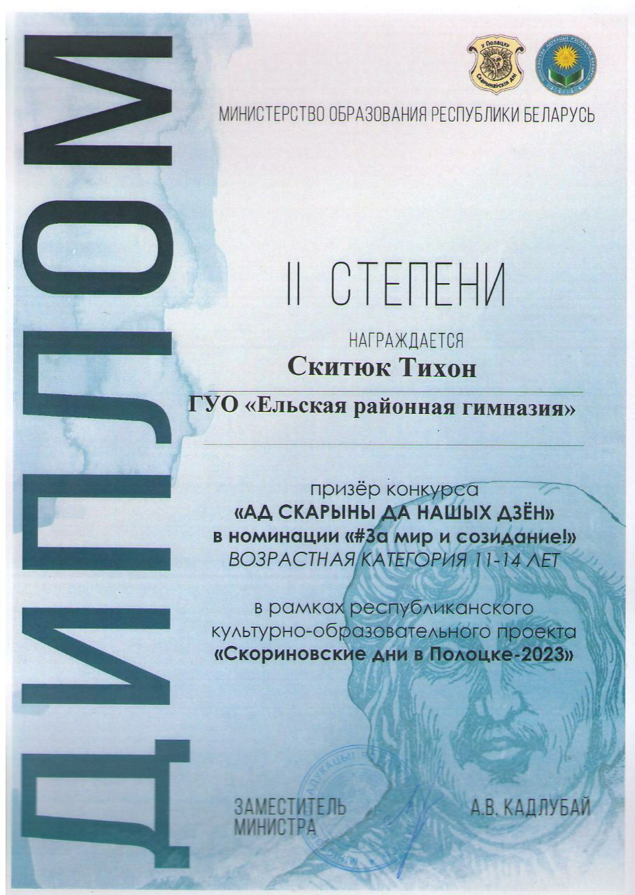 Дипломом 2 степени Министерства образования Республики Беларусь награждён учащийся 7 класса Скитюк Тихон, победитель в секции » Ад Скарыны да нашых дзён» в номинации «#За мир и созидание!» под руководством учителя информатики Алешко Т.И. Поздравляем победителя, желаем дальнейших успехов!