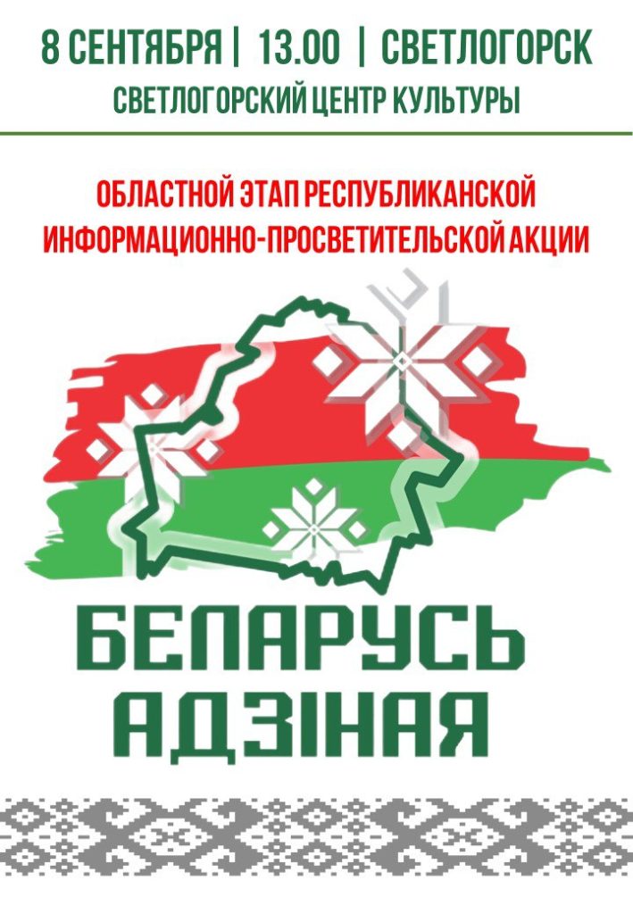 Среди спикеров областного этапа республиканской информационно- просветительской акции “Беларусь Адзіная” видные белорусские общественники— председатель правления Белорусского общества «Знание» Вадим Гигин, первый секретарь ЦК ОО «БРСМ» Александр Лукьянов, председатель РОО «Белая Русь» Олег Романов, заместитель председателя Федерации профсоюзов Беларуси Вадим Грачёв, первый заместитель председателя Республиканского Совета Белорусского общественного объединения ветеранов Юрий Луцик и другие. И это неслучайно, ведь мероприятие приурочено к исторически значимой дате — Дню народного единства 17 сентября.