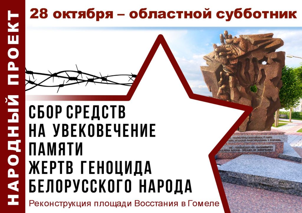 28 октября в Гомельской области пройдет региональный субботник, сообщает телеграм-канал «Гомельщина официально». Участниками трудовых десантов станут представители власти, депутатского корпуса, коллективов предприятий, организаций, учреждений, общественных объединений, молодежь, небезразличные к судьбе и облику родного края жители региона. Во время субботника работы развернутся в населенных пунктах, на производственных территориях, вдоль магистралей, на мемориалах, воинских захоронениях, в парках, скверах, аллеях, местах массового отдыха людей и в других точках. Заработанные на субботнике средства направят на увековечение памяти жертв геноцида белорусского народа — финансирование работ по реконструкции площади Восстания в Гомеле.