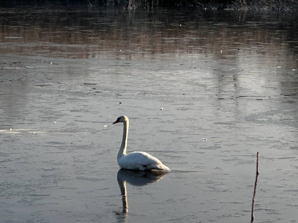 Жители Ельска беспокоятся за жизнь лебедя, оставшегося зимовать на пруду в районе ул. Заречной.