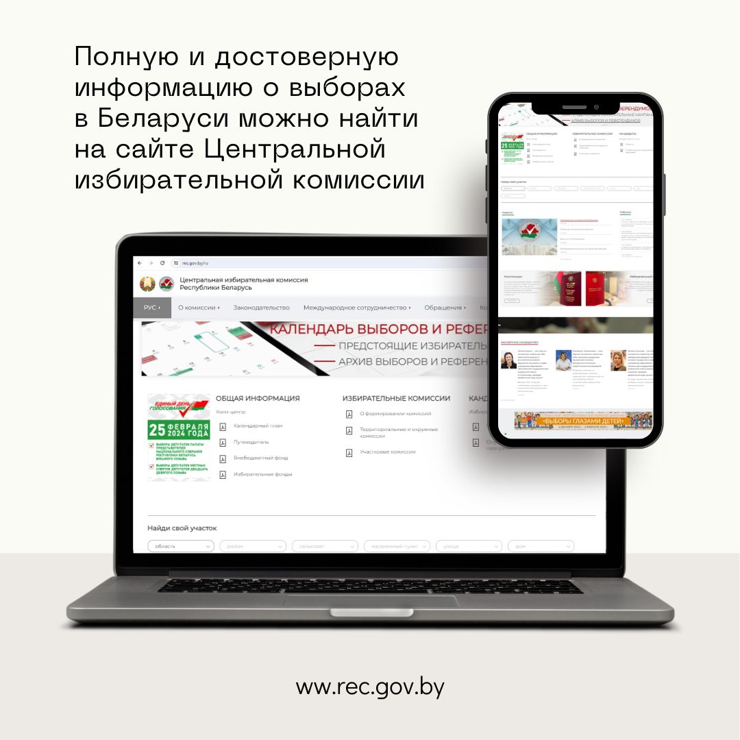 На главной странице официального сайта ЦИК Беларуси (https://rec.gov.by/ru) запущен сервис по поиску участка для голосования, а в разделе, посвященном текущей избирательной кампании, размещены адреса и телефоны всех территориальных, окружных и участковых избирательных комиссий.