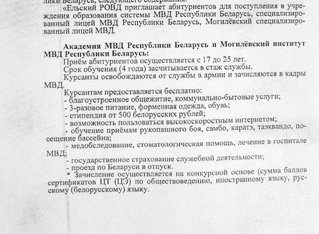 Ельский РОВД приглашает абитуриентов города Ельска и Ельского района для поступления в учреждения образования системы МВД Республики Беларусь в специализированный лицей МВД (г.Минск) и Могилевский специализированный лицей МВД (г.Могилёв).