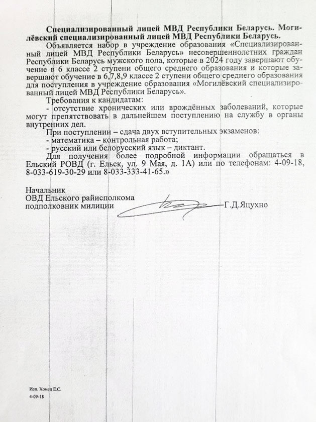 📎🗒Ельский РОВД объявляет набор абитуриентов из числа учащихся 6 классов города Ельска и Ельского района для направления на обучение (https://kadet.by/licej-mvd-belarus/) в Специализированный лицей МВД (г.Минск) и учащихся 6,7,8,9 классов для направления на обучение (https://kadet.by/mogilyovskoe-oblastnoe-kadetskoe-uchilishhe/) в Могилевский специализированный лицей МВД (г.Могилёв). Для получения более подробной информации обращаться в Ельский РОВД (г.Ельск, ул. 9 Мая, 1) или по телефонам: 4-09-18, +37533-619-30-29, +37533-333-41-65