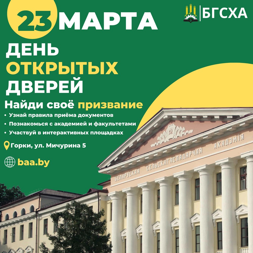 Белорусская государственная сельскохозяйственная академия (БГСХА) – крупнейшее многопрофильное высшее учебное заведение нашей страны, которое готовит высококвалифицированные кадры не только для сельского хозяйства, но и других отраслей. Учитывая то, что сельскохозяйственная отрасль ежегодно нуждается в высококвалифицированных специалистах, выпускников БГСХА ждут хозяйства по всей республике.