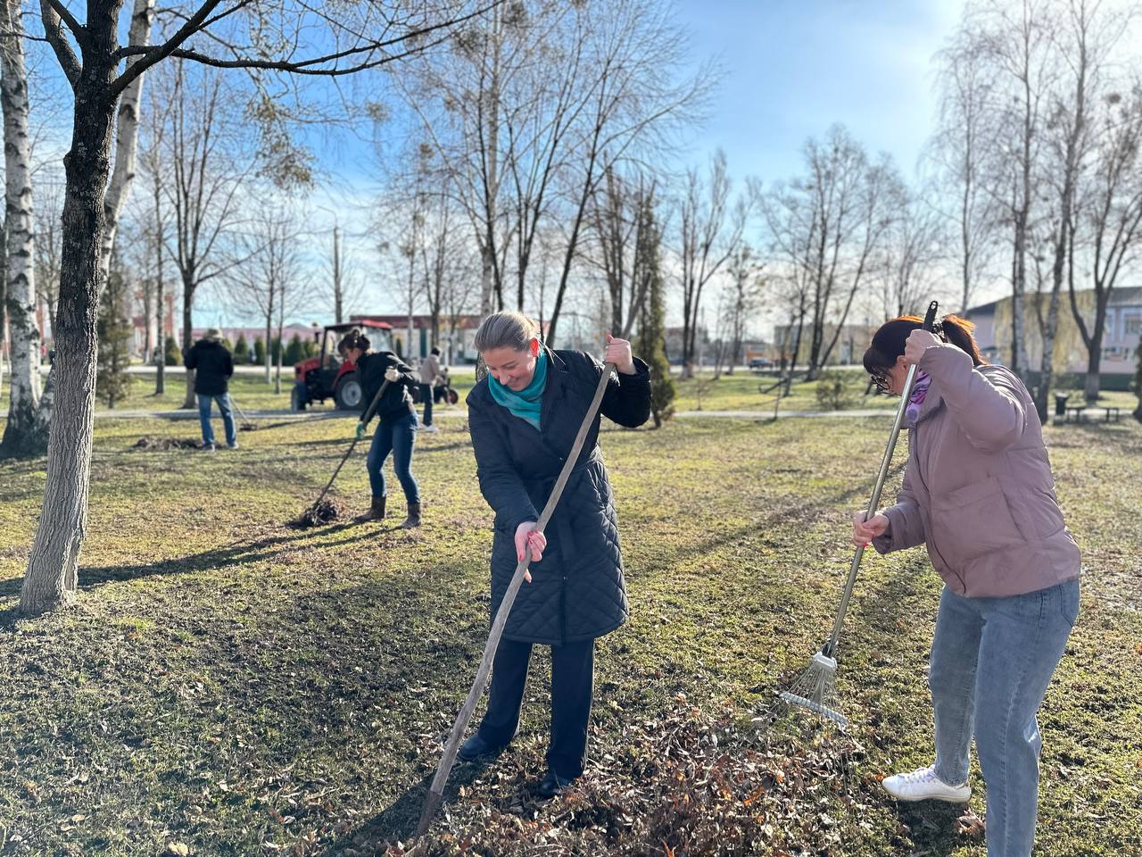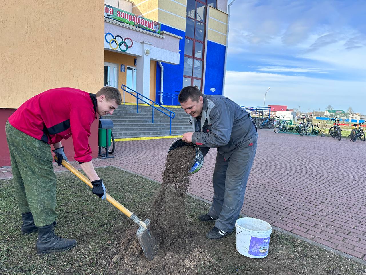 Во время субботника работники Ельской ДЮСШ наводят порядок на стадионе и прилегающей территории. Они делают это с желанием, чтобы детям и всем, кто посещает спортивный комплекс, было комфортно.