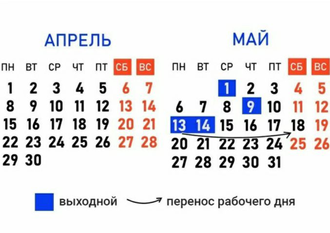 Так, выходными днями при пятидневной рабочей неделе являются: 1, 4, 5, 9, 11-14, 19, 25, 26 мая. Рабочий день 13 мая (понедельник) переносится на 18 мая (суббота).