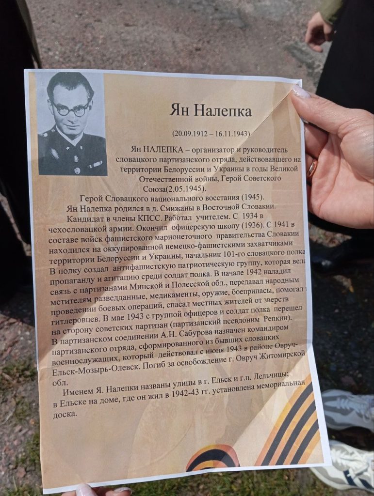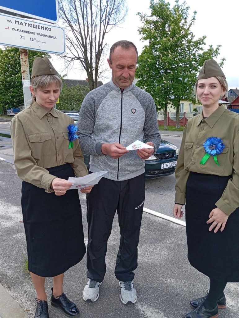 На улицах, названных именами героев, участников Великой Отечественной войны, девушки раздают ельчанам фронтовые треугольники с биографией освободителей.