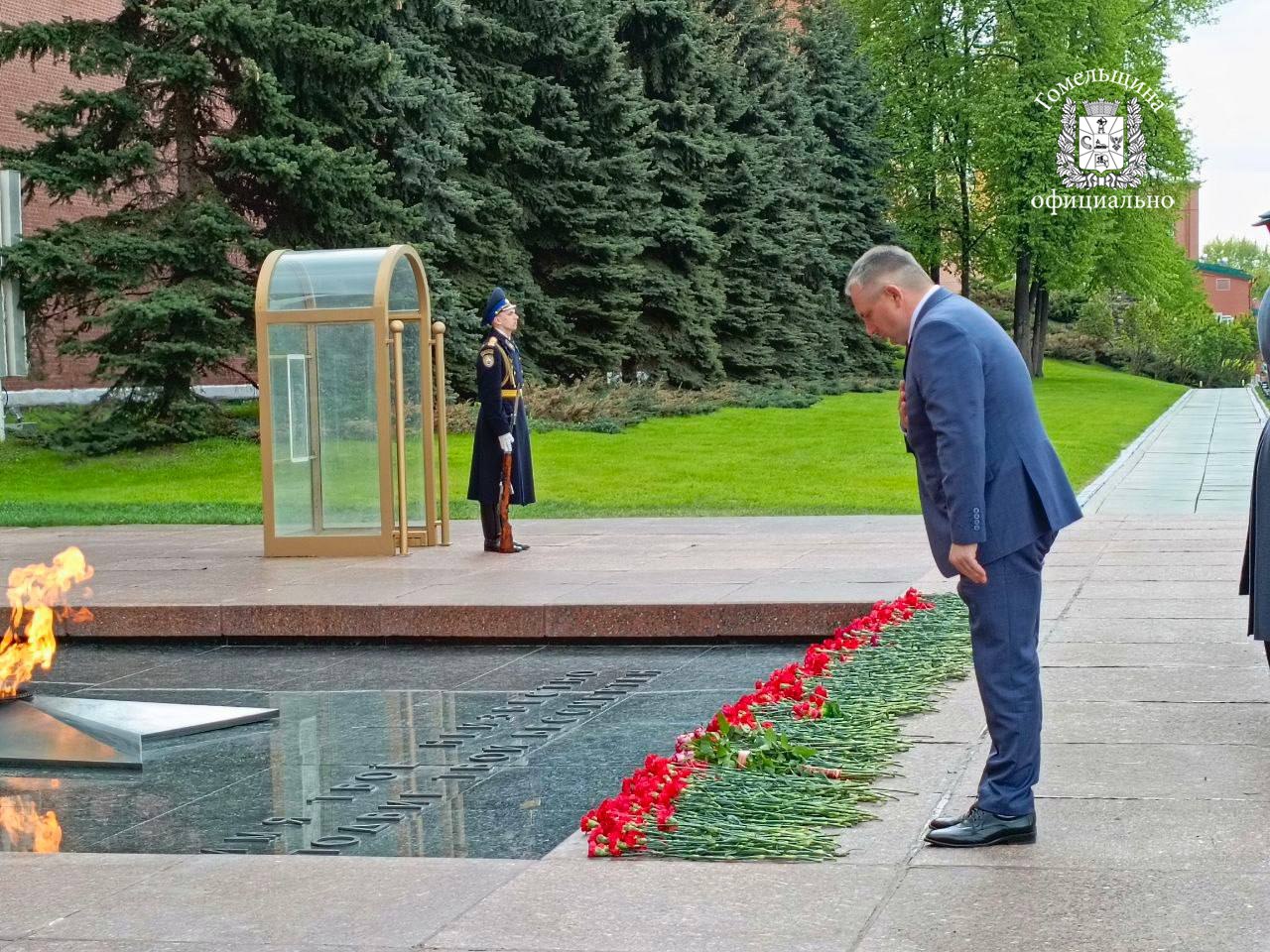 Цветы к Могиле Неизвестного солдата в Александровском саду Москвы накануне Дня Победы возложил председатель облисполкома Иван Крупко.