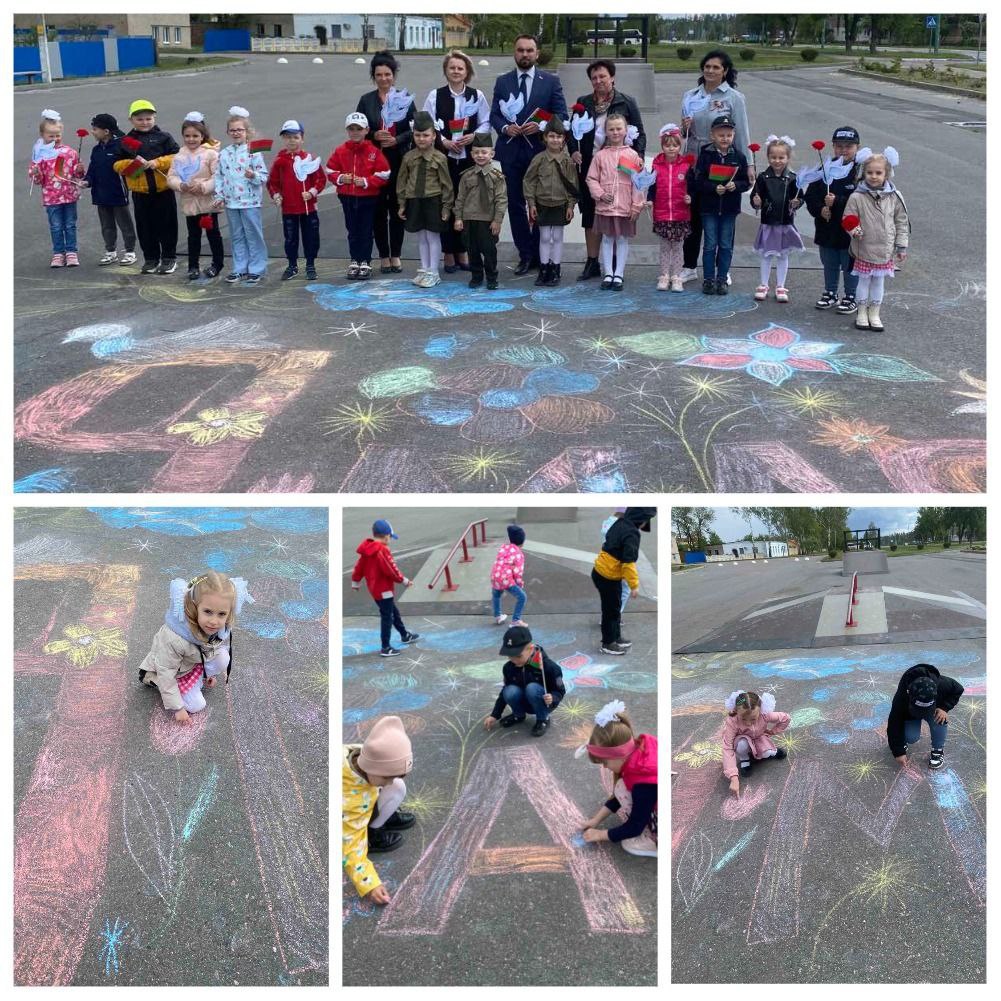 Воспитанники детского сада №1 г.Ельска совместно с представителями Ельского районного Совета депутатов накануне Дня Победы рисовали открытку на асфальте. Этот день стал для ребят по-настоящему ярким! Дети и взрослые с энтузиазмом взялись за разноцветные мелки и скучный серый асфальт заиграл всеми цветами радуги. С наступающим Днем Победы!