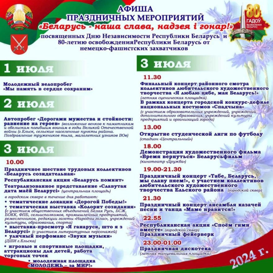 Организаторы праздничных мероприятий обращают внимание, что жители Ельского района могут принять участие в акции «Беларусь помнит!», которая пройдет 3 июля в рамках шествия трудовых коллективов. Портреты своих дедов и прадедов нужно оформить в рамку и подписать.