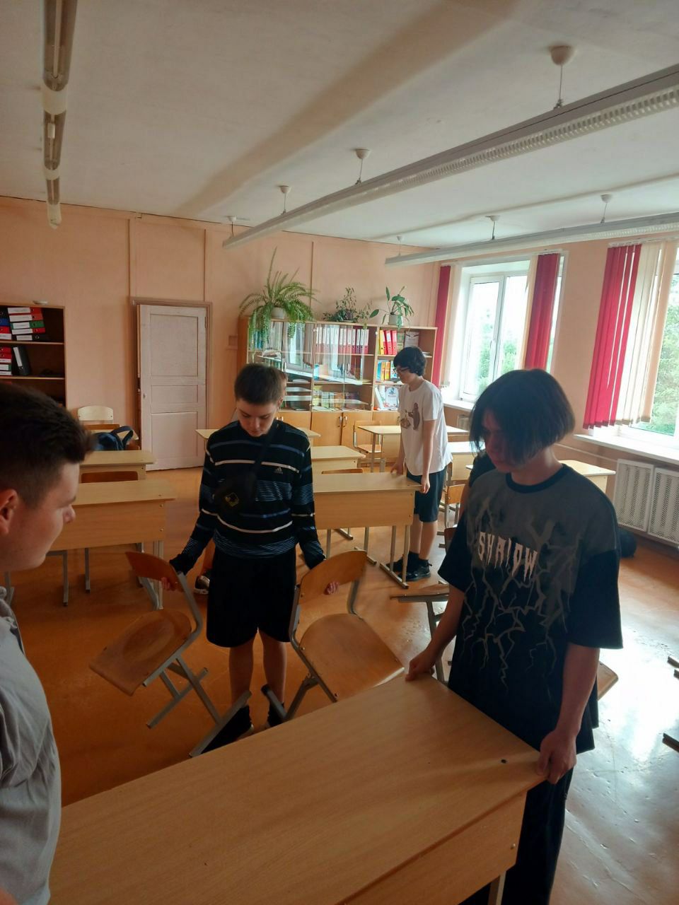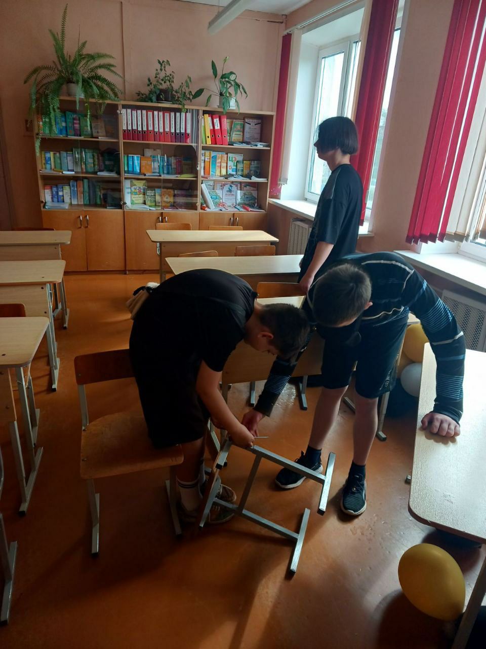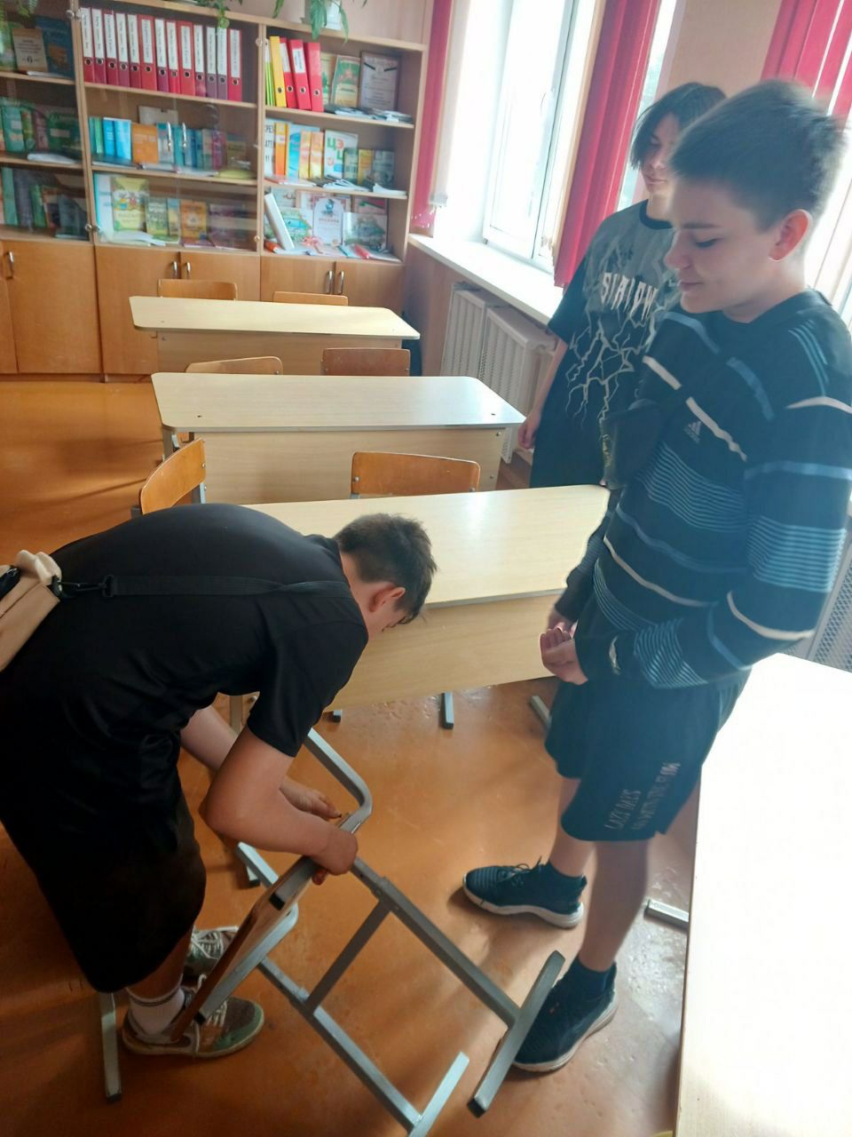Ремонтная ученическая бригада уже начала свою работу. Гимназисты чинят школьную мебель: стулья и столы, подготавливают их к новому учебному году.