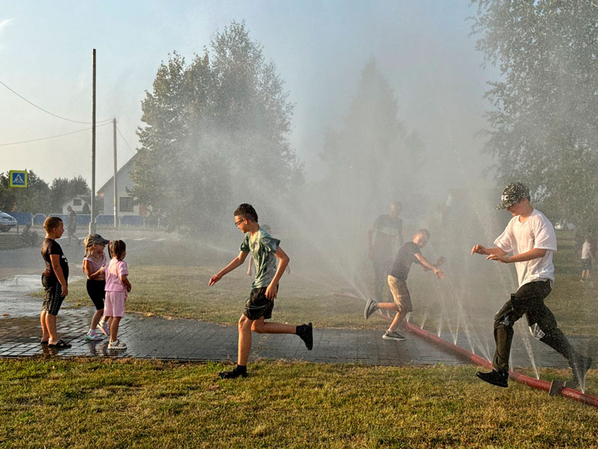 Кульминацией мероприятия стала праздничная водная феерия. Дети были в восторге, ведь в такую жару каждый хочет охладиться под «дождем безопасности».