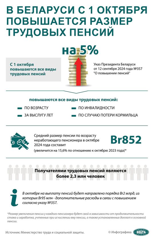 В ведомстве отметили, что в результате перерасчета размер трудовой пенсии увеличится в среднем на 5%, а также подчеркнули, что это второе повышение в текущем году — первое произведено с 1 февраля на 10%. По предварительной оценке, средний размер пенсии по возрасту в октябре 2024 года составит Br852, а общее годовое увеличение (октябрь 2024 года к октябрю 2023-го) — Br115, или 15,6%. Размер увеличения трудовой пенсии у каждого пенсионера будет зависеть от стажа, величины заработка, учтенных при исчислении ему пенсии и установленных доплат к основной пенсии.
