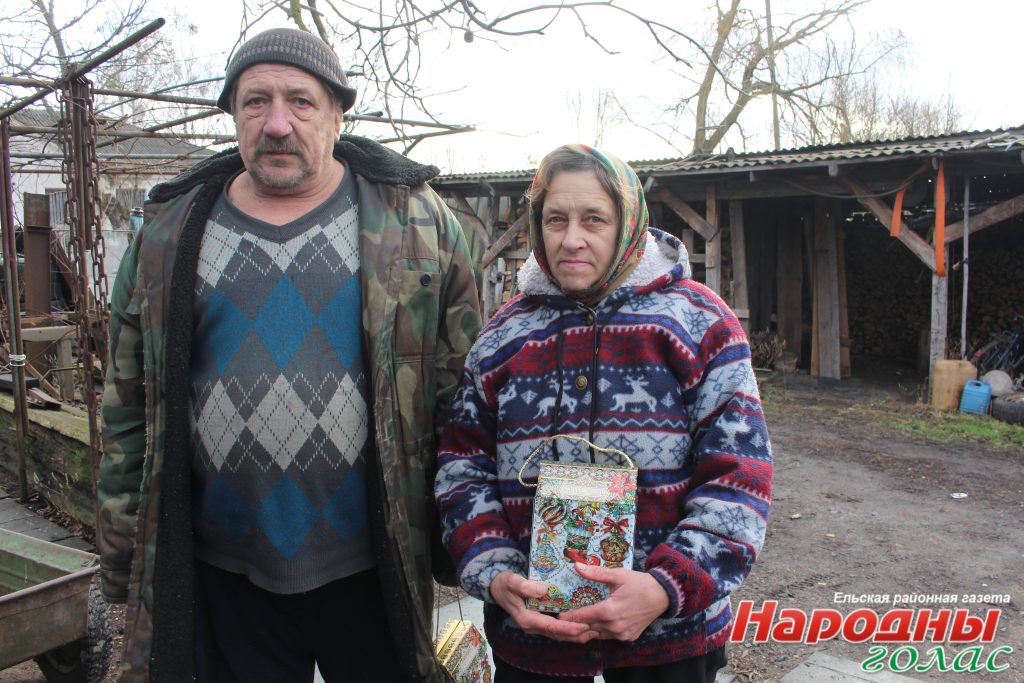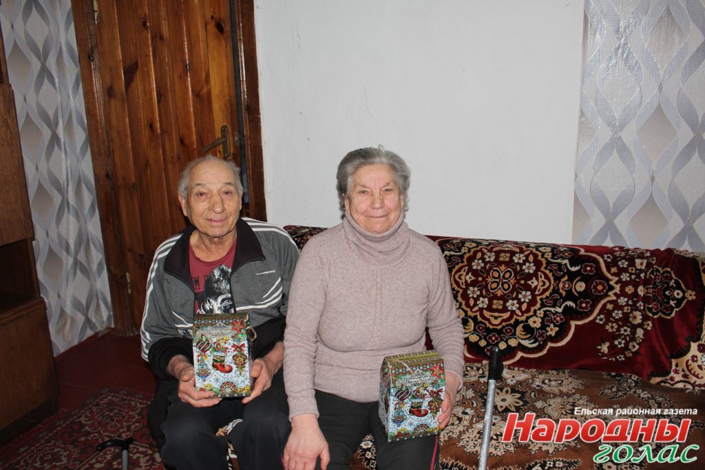 Сладкие подарки участники акции вручили, пожелав здоровья и долголетия, мира и благополучия, супружеской паре Елене и Николаю Каноплич, много лет проработавших в КСУП «Ельск»; бывшему трактористу Леониду Дудковскому из аг. Ремезы.