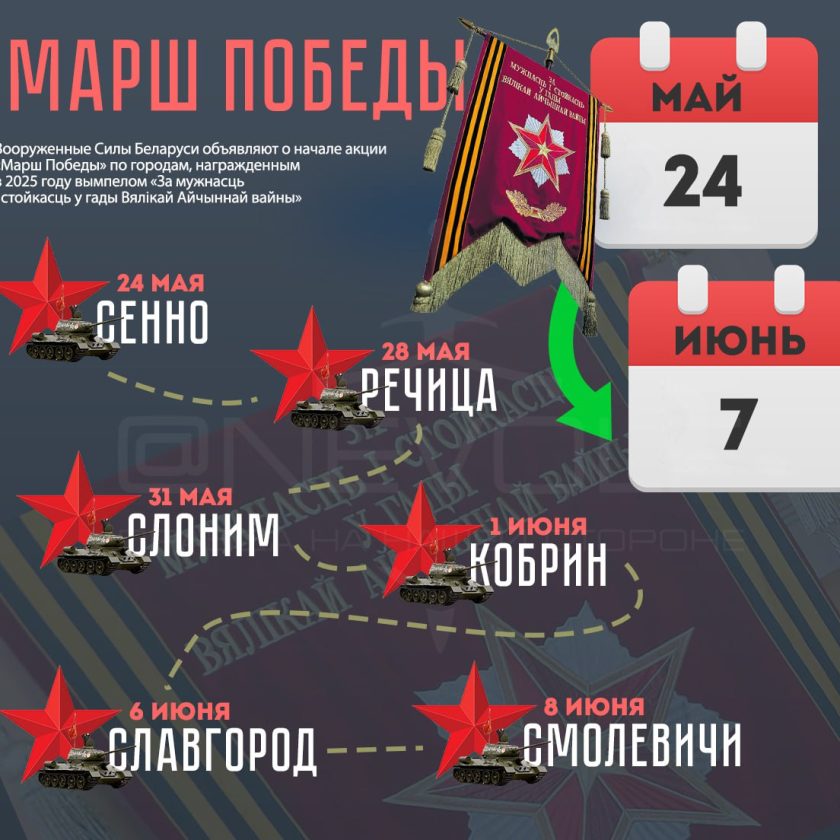 С 24 мая по 7 июня в шести городах Беларуси пройдет акция «Марш Победы», приуроченная к чествованию городов, удостоенных вымпела «За мужнасць і стойкасць у гады Вялікай Айчыннай вайны» в 2025 году.