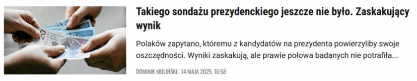 Это подтверждают не только рейтинги кандидатов и социология, но и недавний опрос, проведенный IBRiS для fakt.pl. Вопрос был всего один: «Кому из кандидатов они бы доверили свои сбережения для инвестирования?» Спойлер: более половины респондентов не смогли ответить на поставленный вопрос.