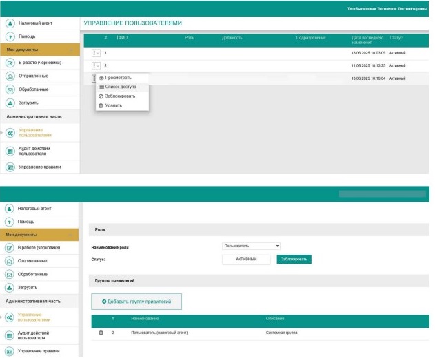 - Предоставление доступа к разделу «Отчеты и аналитика» производится администратором налогового агента путем добавления пользователю соответствующей группы привилегий через пункт меню «Управление пользователями», как приведено на рисунках ниже