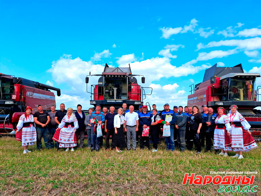 Чествование лидеров жатвы с достижением тысячного рубежа прошло сегодня прямо в поле. Комбайнеров и водителя поздравила председатель Ельского районного Совета депутатов Оксана Захарченко, представители ОАО «Мозырьсоль» и профсоюзного комитета предприятия, а также председатель Старовысоковского сельского Совета Мария Алесич. Они пожелали хлеборобам здоровья и достижения новых трудовых побед, а также вручили Благодарственные письма и подарки.