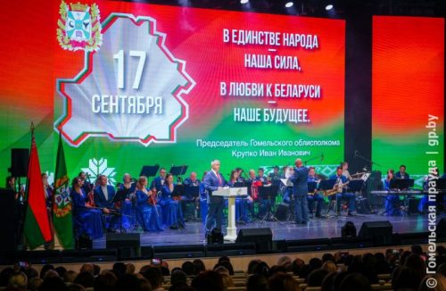 В общественно-культурном центре прошло торжественное собрание в День народного единства. Председатель Гомельского облисполкома Иван Крупко наградил жителей области, которые внесли весомый вклад в развитие нашего государства и патриотического воспитания молодежи. Праздничный вечер завершился акцией «Поем вместе с оркестром»: под аккомпанемент эстрадно-симфонического оркестра зал исполнил любимые хиты белорусской эстрады и народные песни.