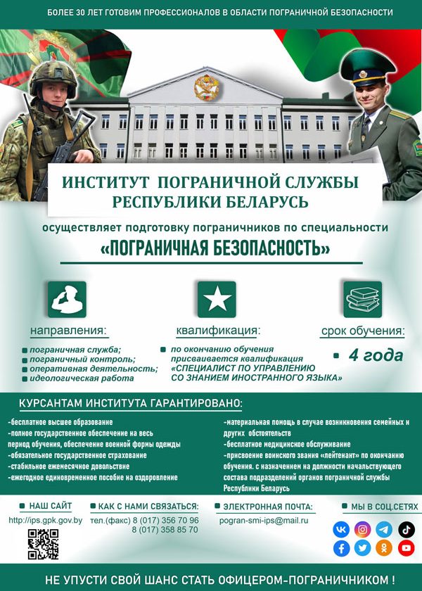 Интеллект. Патриотизм. Сила – основа характера каждого пограничника, воспитание которого проходит в единственном, уникальном в своём роде, высшем учреждении образования — Институте пограничной службы Республики Беларусь.
