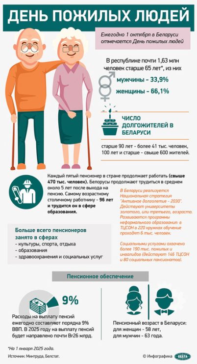 Пенсионный возраст в Беларуси: для женщин — 58 лет, для мужчин — 63 года.