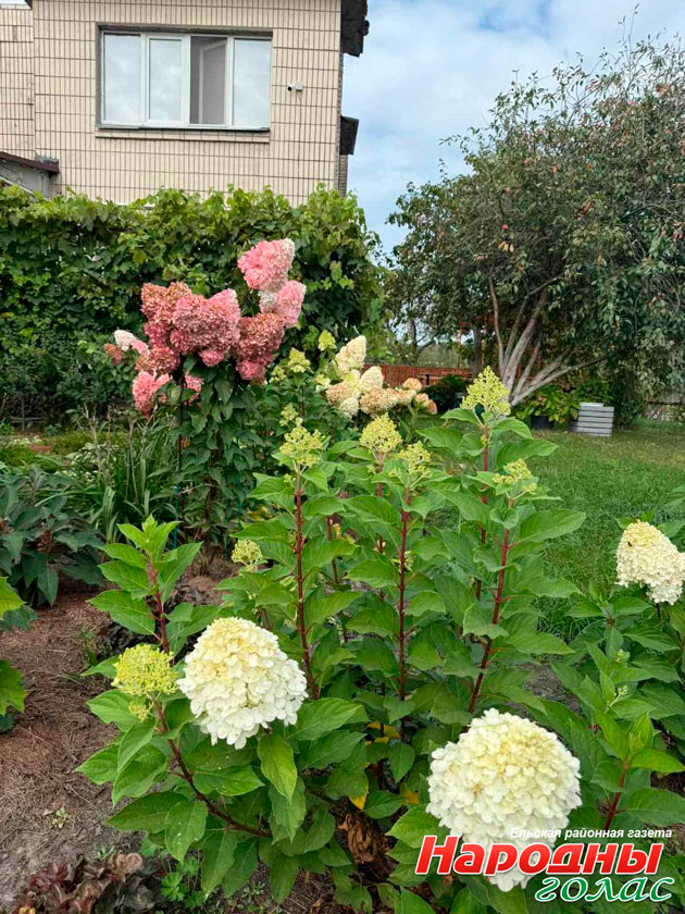 Со временем вкусы хозяйки изменились в сторону многолетников. Особую нежность она питает к гортензиям. В ее коллекции есть разные сорта: широколистные гортензии радуют цветением все лето, окрашивая участок в розовые и бордовые тона. Метельчатые гортензии подхватывают эстафету к осени, вырастая пышными, огромными кустами.