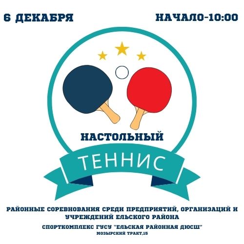 Районные соревнования по настольному теннису среди предприятий, организаций и учреждений Ельского района пройдут в Ельске 6 декабря. Встретятся лучшие игроки, чтобы показать свои способности и спортивную удаль.