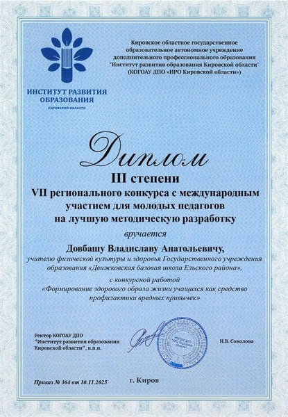 Учитель физической культуры и здоровья Движковской базовой школы Ельского района получил заслуженную награду — Диплом III степени на VII региональном конкурсе с международным участием среди молодых педагогов за отличную методическую разработку!