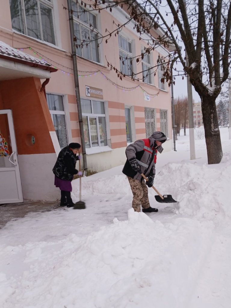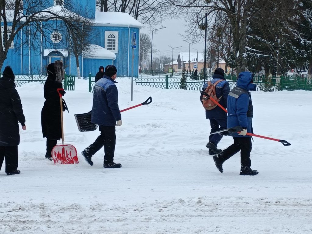 Работники предприятий и организаций очищают территорию вокруг административных зданий и производственных цехов, поддерживая чистоту улиц и помогая коммунальной службе справляться с последствиями непогоды.