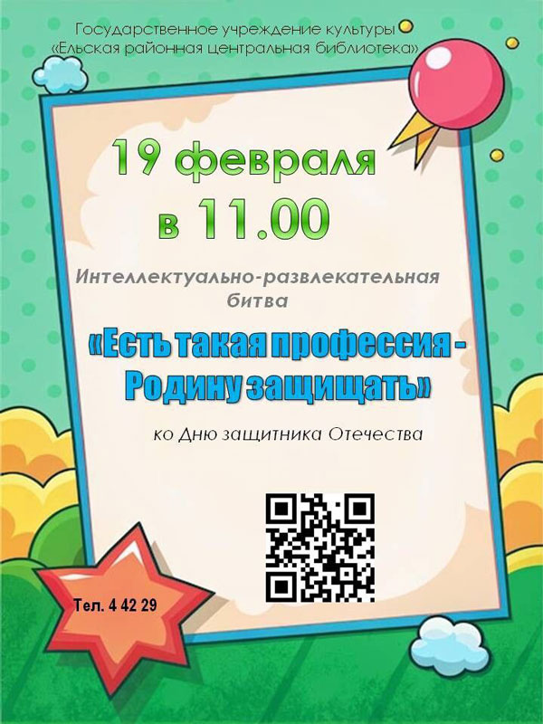 19 февраля в 11:00 Ельская районная центральная библиотека приглашает всех желающих на интеллектуально-развлекательную битву «Есть такая профессия – Родину защищать». Отметим День защитника Отечества весело и с пользой!