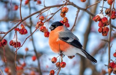 - Ягоды и фрукты. Замороженная рябина, облепиха, яблоки (дольками). На такие угощения особенно реагируют дрозды, свиристели и снегири.